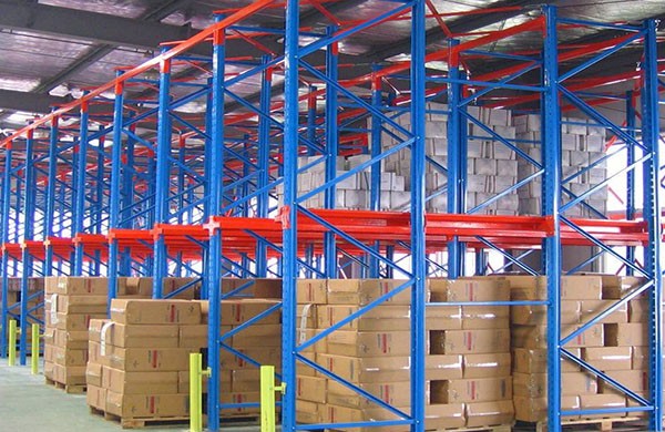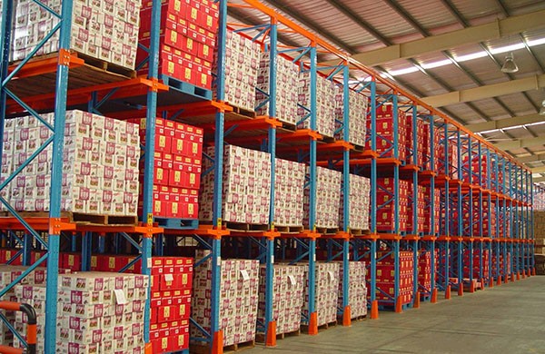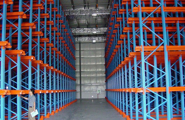 靠墙区域的货架总深度更好控制在6个托盘深度以内,中间区域可两边进出的货架区域总深度更好控制在12个托盘深度以内,以提高叉车存取的效率和可靠性,此类货架系统中,叉车为持续“高举高打”作业方式,叉车易晃动而撞到货架,故此类仓储系统稳定性相对差一点,货架不宜过高,通常应控制在10m以内,且为了加强整个货架系统的稳定性,除规格、选型要大一些外,还须加设水平和垂直拉固装置。